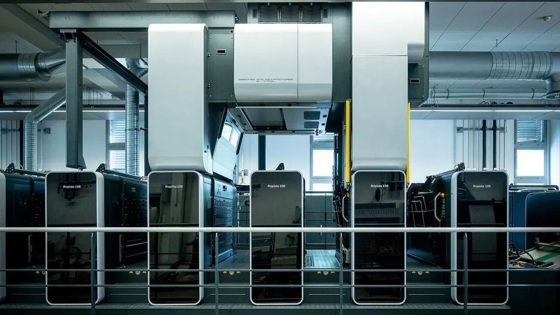 Beginnen wir ganz klassisch mit dem Druck: Die Rapida 106 X setzt als High-End-Bogenoffsetmaschine im 3b-Mittelformat die Standards bei Automatisierung mit Fortdruckleistungen bis zu 22.000 Bogen/h. Das entspricht einer bedruckten Fläche von 2,4 Fußballfeldern pro Stunde!