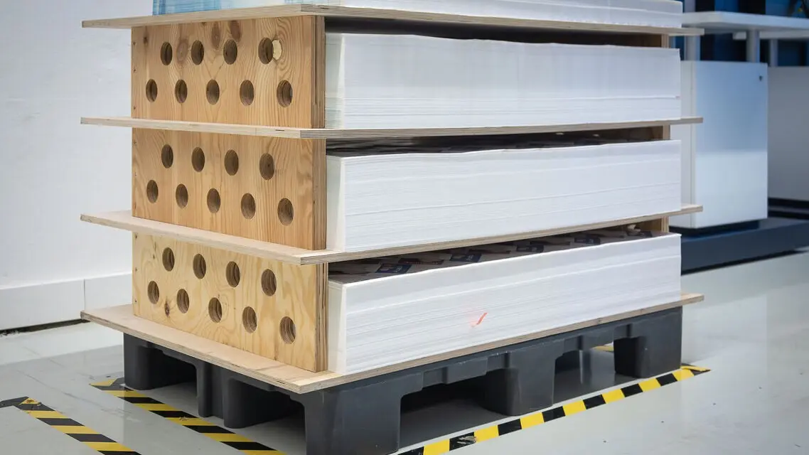 Eine weitere Innovation für die IML-Produktion ist die automatisierte Hürdenauslage. Sie sorgt dafür, dass konventionell gedruckte IML-Label abschmierfrei und nonstop in kleinen Auslagestapeln abgelegt werden können. Die einzelnen Hürden werden dabei vollautomatisch von der Rapida erzeugt. Der Bedienende kann anschließend in Ruhe Stützen und Brett einlegen. Das ermöglicht höhere Produktionsleistungen und abschmierfreie, unverblockte Stapel, die sich problemlos weiterverarbeiten lassen.