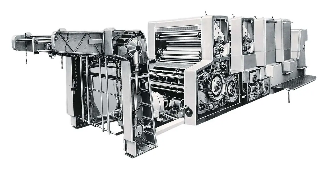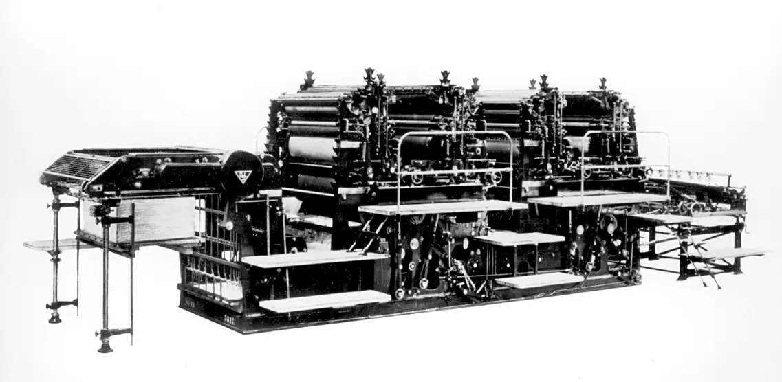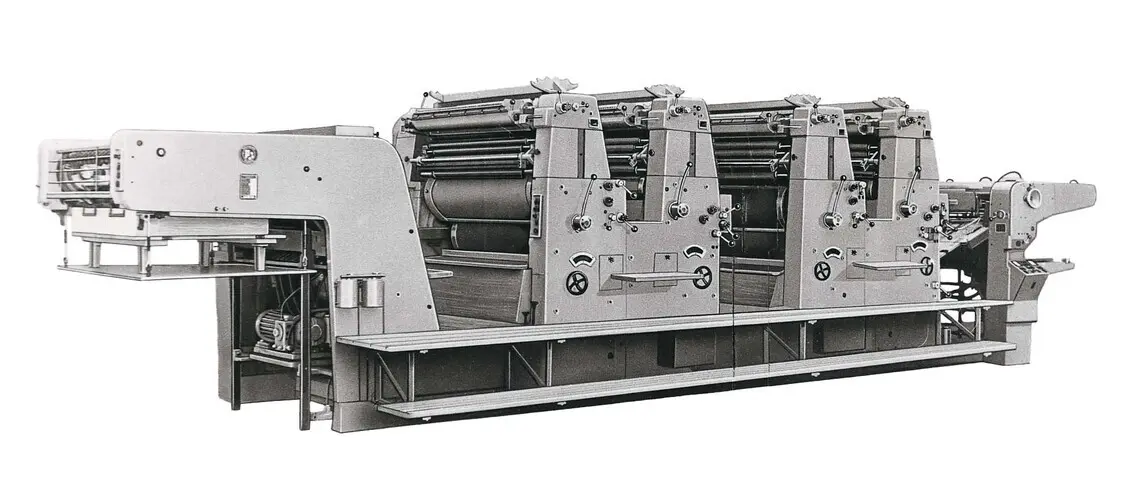 Indem man dann zwei dieser Druckwerke hintereinander schaltete und den Bogentransport zwischen den beiden über Ketten und Greiferwagen realisierte, war die nächste Innovation geboren: die erste Vierfarben-Bogenoffsetmaschine. 1932 gebaut – also vor exakt 90 Jahren – war sie unter dem Namen Planeta Deca auf der Fachmesse TPG in Paris zum ersten Mal zu sehen. Bedruckstoffe, Farben und Hilfsmittel hielten dem Nass-in-Nass-Druck mit vier Farben damals zwar noch nicht stand. Trotzdem ging die Maschine nach der Messe an eine Pariser Druckerei und produzierte dort bis ins Jahr 1966 hinein. Auch wenn die Planeta Deca ihrer Zeit voraus war, so setzte sie dennoch ein Zeichen, wie die Entwicklung des Offsetdrucks weitergehen könnte.