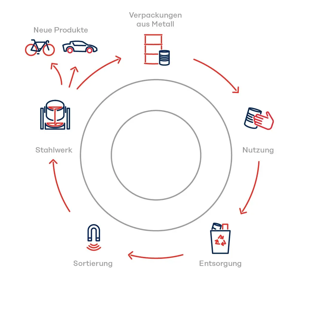 Mit dem Verbrauch des Inhalts ist der Lebenszyklus einer Blechverpackung aber noch lange nicht beendet. Durch Recycling wird aus der Lebensmitteldose von heute die Autokarosserie von morgen und die Schiffsschraube von übermorgen - oder eben wieder eine Dose. Die einmal eingesetzten Rohstoffe gehen nicht verloren, sondern werden in einem geschlossenen Kreislauf weiter genutzt. Die Wiederverwertung einer Tonne Metallverpackungen spart mehr als zwei Tonnen Rohstoffe ein. Der Energieverbrauch kann um bis zu 95 Prozent verringert werden und damit sinkt auch der Ausstoß von Emissionen.