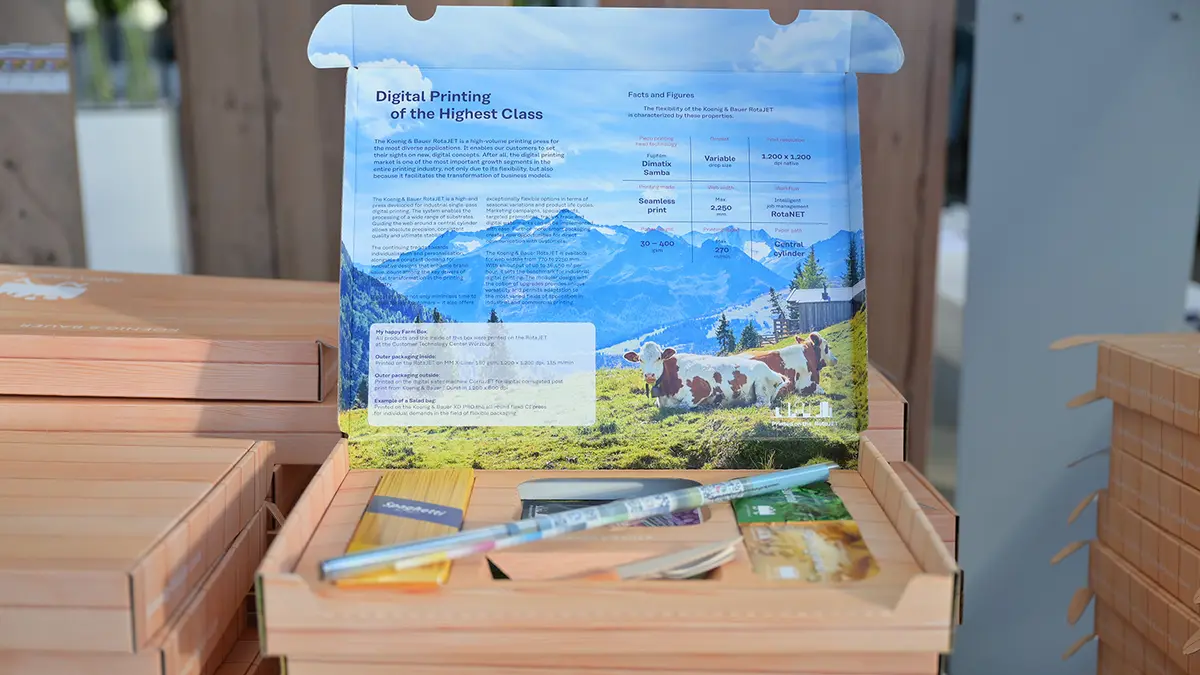 Als Marktführer im digitalen Dekor- und Verpackungsdruck bot Koenig & Bauer Brand Ownern und Kund:innen in Live-Produktdemonstrationen vollständig interaktive Erlebnisse der CI-Flexo- und RotaJET-Druckmaschinen. Mehr als 150 Menschen konnten in die Geschichte von Koenig & Bauers eigens kreierter Marke „Happy Farm Box“ eintauchen, um die sich die zweitägige Veranstaltung drehte.