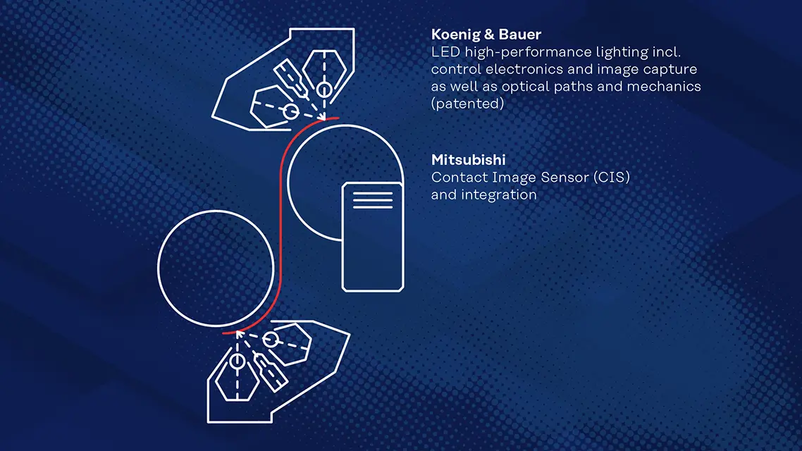 Zentrale Elemente dieses Moduls sind das Koenig & Bauer eigene Inspektionsmodul inklusive Koenig & Bauer LED-Hochleistungsbeleuchtungen sowie der Mitsubishi Contact Image Sensor (CIS).