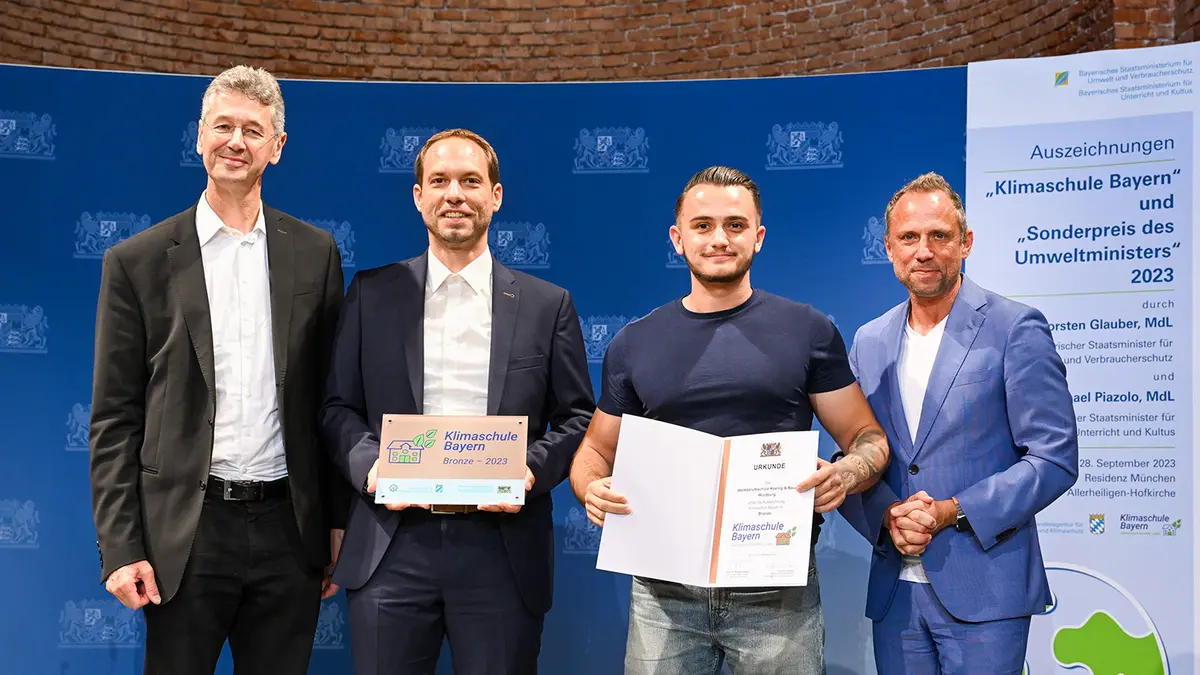 Die Urkunde in der Zertifizierungsstufe Bronze erhielt Schulleiter Manuel Eisenmann im Rahmen einer Preisverleihung am 28. September 2023 in München aus den Händen von Michael Piazolo, Bayerischer Staatsminister für Unterricht und Kultus, und Thorsten Glauber, Bayerischer Staatsminister für Umwelt und Verbraucherschutz. Damit trägt die Werkberufsschule Koenig & Bauer neben 50 weiteren Schulen aus Bayern fortan das Prädikat einer Klimaschule.