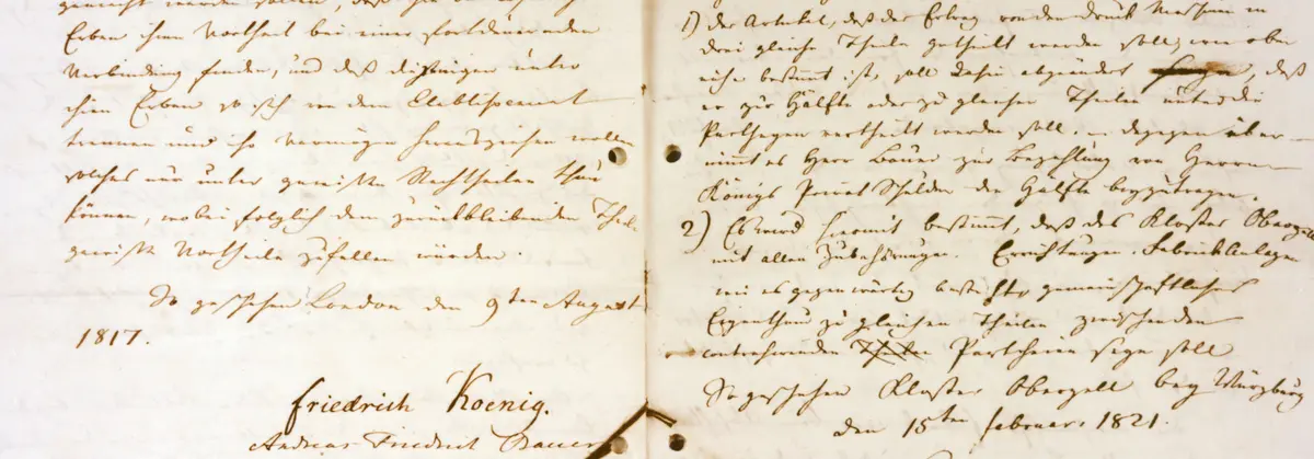 Friedrich Koenig and Andreas Bauer establish Schnellpressenfabrik Koenig & Bauer in a secularised monastery in Oberzell near Würzburg, with the official founding contract being signed on the 9th of August 1817. Over the following decades and centuries, the company achieves considerable success with its high product quality and countless innovations. The entry into webfed press manufacture later lays the foundations for today’s Koenig & Bauer Digital & Webfed.