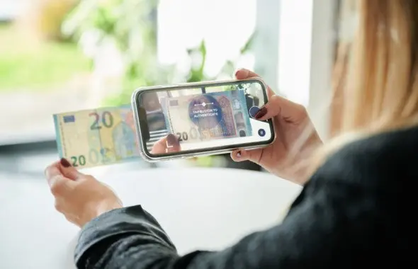 Fast banknote authentication. The ValiCash™ app can authenticate a banknote and show in less than a second whether it is genuine – depending on the phone model. Test it yourself. Authentication does not require any special colors or hidden features in the design: banknotes already in circulation can be authenticated.